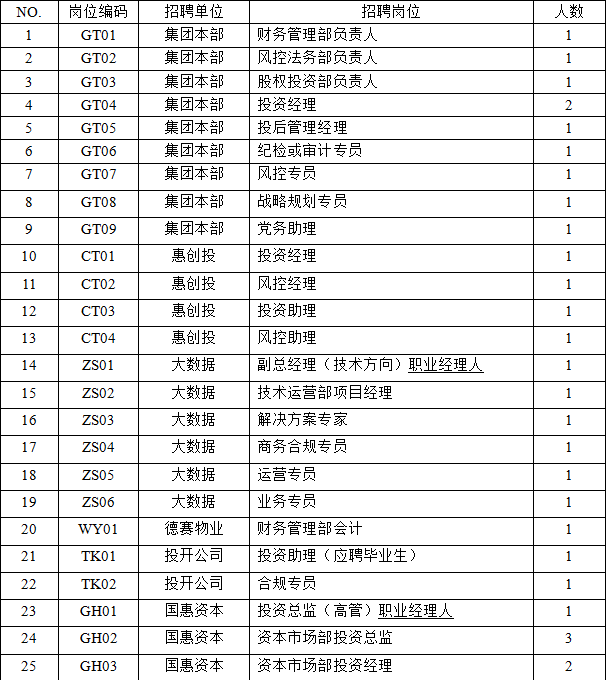 招聘崗位數(shù)量25個,招聘人數(shù)共29人,分類如下表:各招聘崗位工作職責(zé)、任職條件、薪酬待遇等詳見附件1.惠州市國有資本投資集團(tuán)有限公司2023年招聘崗位信息表。